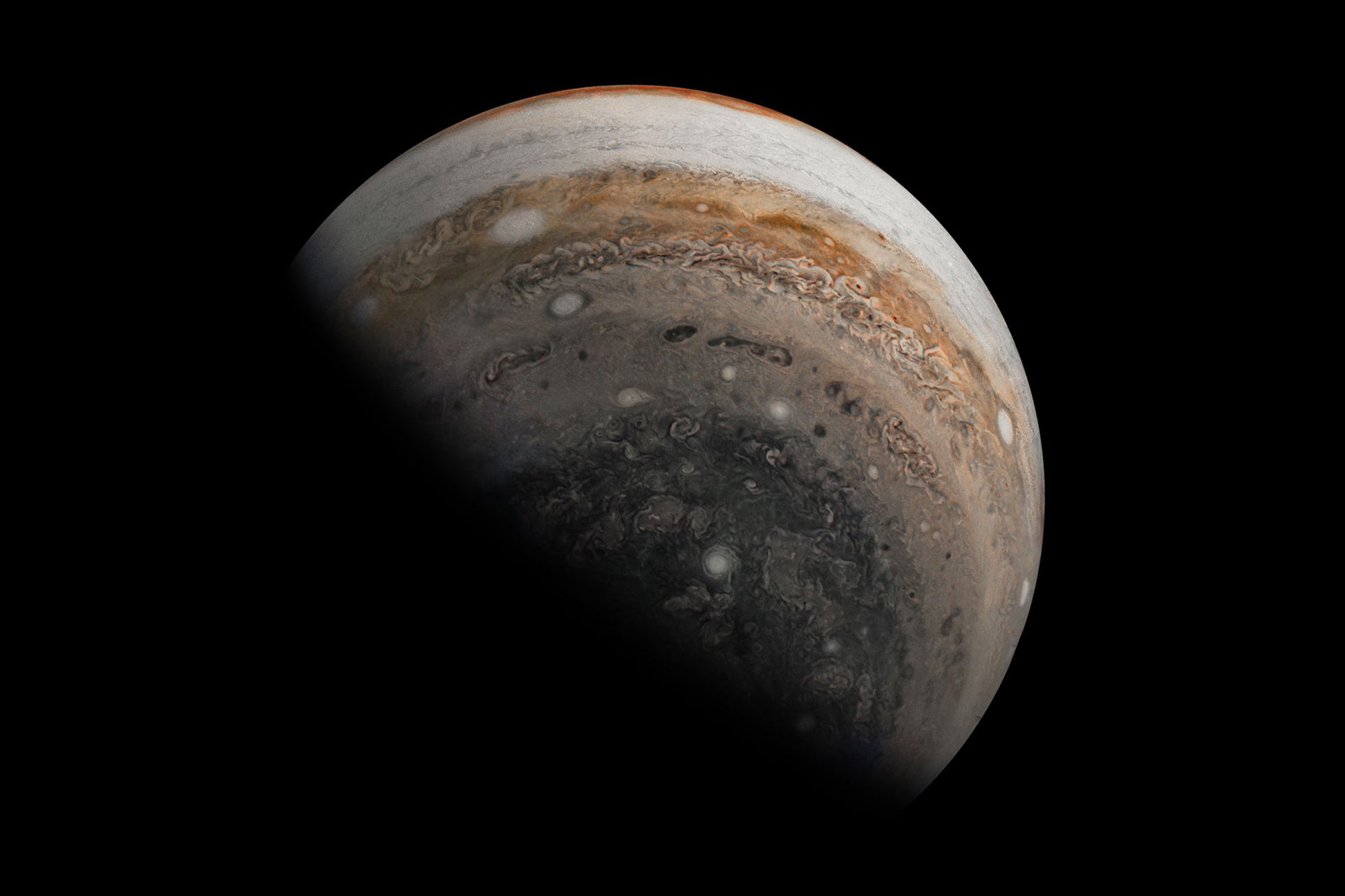 Juste après son survol de Jupiter, la sonde Juno de la NASA a capturé cette vue saisissante de l'hémisphère sud de Jupiter alors que la sonde s'éloignait de la planète géante. Cette image capture des cyclones massifs près du pôle sud de Jupiter, ainsi que les nuages chaotiques de la région filamentaire plissée, la zone turbulente entre la bande orange et la région polaire brunâtre.